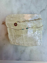 five (4mm) faceted glass beads adorns this simple chain bracelet in the colors of the trans flag. Includes a 2" adjustable chain.